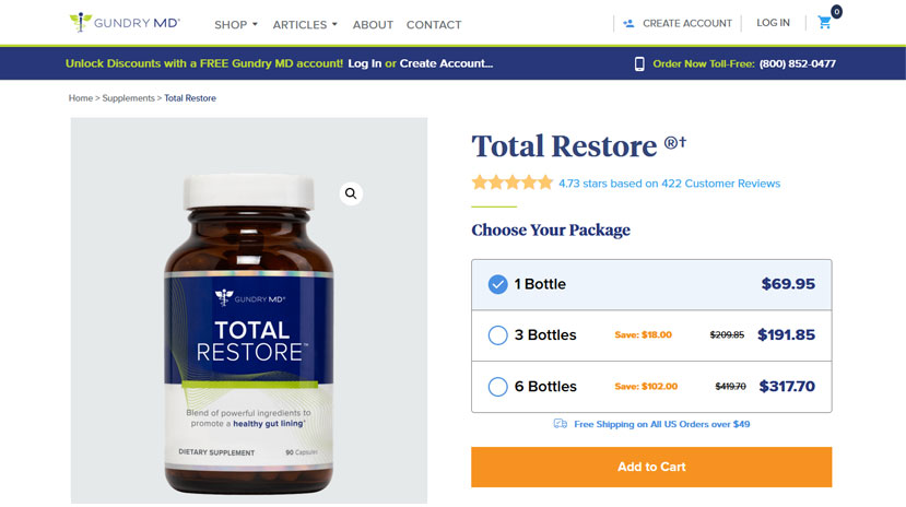 Only their ambassador website, http://gundrywellness.com/, accepts this Gundry MD Total Restore coupon code, and only this site gives the discounted price. Therefore, click on that link to take advantage of the best savings opportunities. The “GET DEAL” button on our website will also take you to the Gundry MD wellness ambassador page. So go ahead and click “GET DEAL” to receive that 30% discount on Gundry MD Total Restore and enjoy significant savings thanks to the offers.